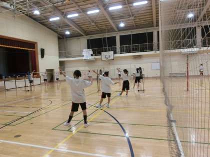 バドミントン部です。基本となるフォームの確認をしている様子です。