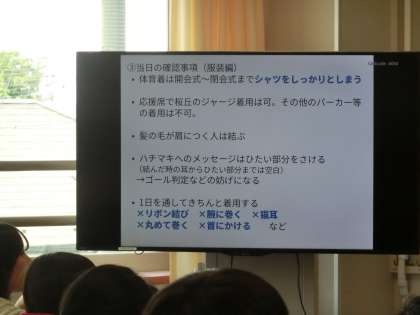 4時間目には明日の運動会の前日指導が行われました。明日はいよいよ運動会本番です。暑くなりそうですので水筒を忘れずに持参してください。