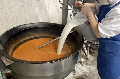 トマトのポタージュを調理している様子です。玉ねぎをじっくり炒めて鶏がらスープで煮ます。一度釜から取り出しミキサーにかけてなめらかにします。それを釜に戻して牛乳等を入れて仕上げます。トマトの旨味やほのかな酸味でおいしいポタージュができあがります。