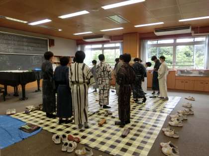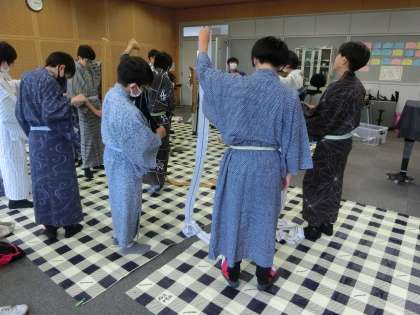 2年生では地域の方にお手伝いしていただいて、着物の着付け教室を行いました。今日はB組が行いました。