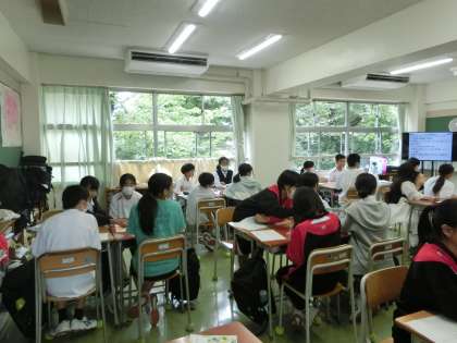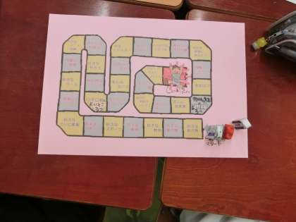 1年生の学活の様子です。今日は「すごろくトーク」を行いました。双六の要領でマスに書かれている内容を班員に伝えるといったゲームです。例えば「好きな食べ物は何?」といったことがかかれています。答えにくいものはパスができるそうです。