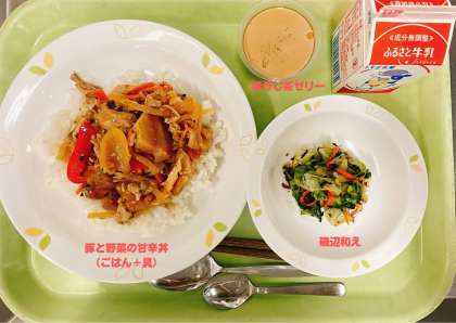 【献立】 ・豚と野菜の甘辛丼 ・磯辺和え ・ほうじ茶ゼリー ・牛乳