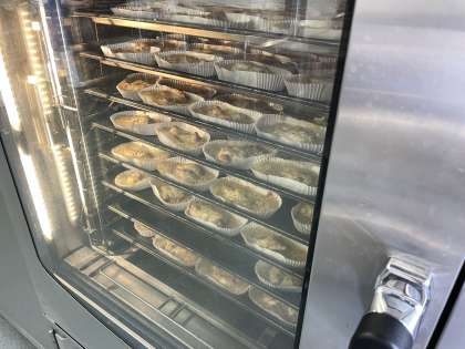 チキンのチーズ焼きをオーブンで焼いている様子です。全体的にきれいに焼き色がつきました。