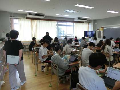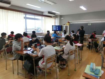 3年生の理科の研究授業です。今日は生物の進化について班で話し合って学びを深めていきました。