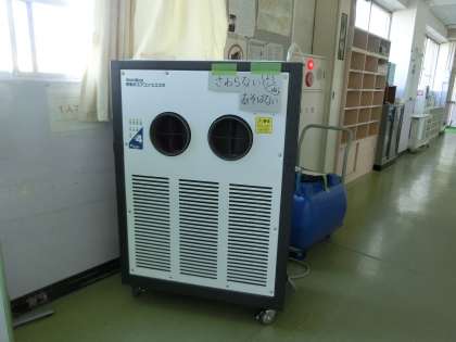 一階のヘルプデスク前に移動式エアコンを設置しました。涼しい風が出ています。