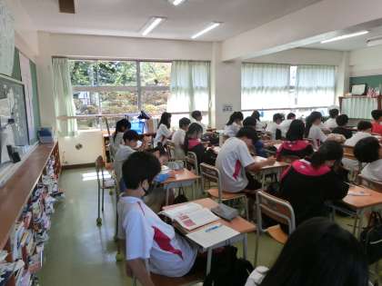 金曜日の1時間目は全校一斉に道徳の授業を行っています。こちらは1年生の様子です。