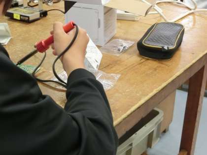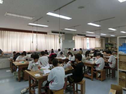 2年生の技術の授業ではラジオ制作を行っております。今日はハンダを使って回路を作りました。