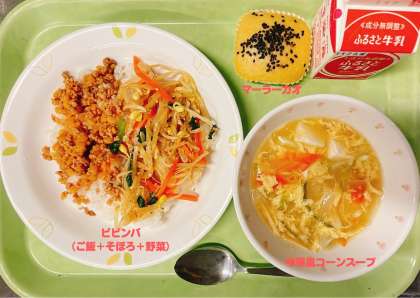 【献立】 ・ビビンバ ・中華風コーンスープ ・マーラーカオ ・牛乳