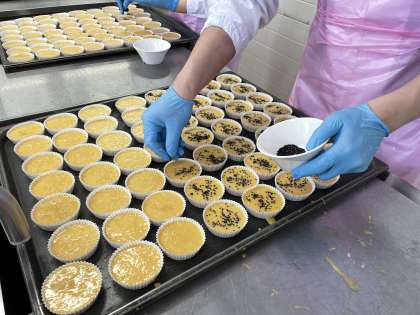 中華風の蒸しパン「マーラーカオ」を作りました。生地をカップに入れた後、黒ゴマを散らしていきます。ぷっくりきれいに膨らみました。