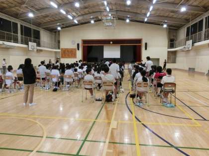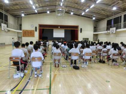 1年生の学年集会です。学年主任のお話の後、今学期が学年として取り組んできた「ちょいボラ」(小さなボランティア活動)に特に貢献した生徒を表彰いたしました。