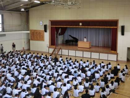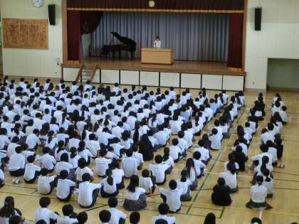 生活指導主任の先生より、一学期の振り返りと夏休みの生活についてお話がありました。