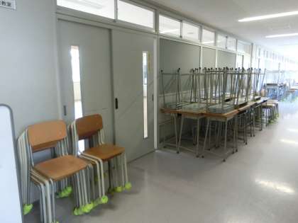 2年生の教室は来週ワックスがけを行いますので机椅子が廊下に出されています。廊下が狭くなっていますので気を付けてください。