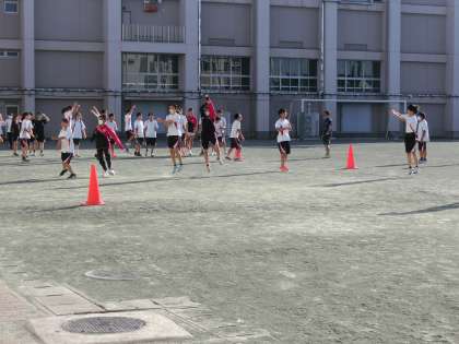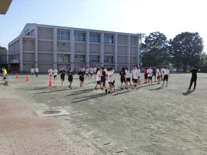 放課後は世田谷区中学校陸上競技大会(区陸)の練習会を行いました。まずは全体でアップです。そのあとは種目ごとに分かれて練習を行いました。