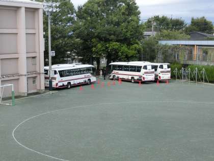 桜丘小学校の校外学習で校庭にバスが駐車しました。