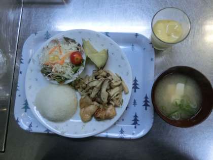 今日はワンプレートでメインは照り焼きチキン。それに秋の味覚のサツマイモときのこを添えたサラダ、そしてごはんとみそ汁、デザートにプリンが付きました。