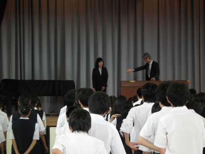6月18日月曜日。朝礼で、1年生の新しい英語の先生が紹介されました。勉強の取り組みをしっかり頑張りましょう。