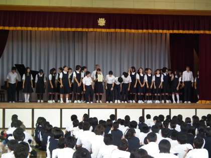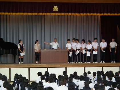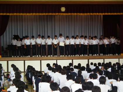 始業式に続いて、夏休み中に活躍のあった部活動の表彰もありました。陸上部、吹奏楽部、サッカー部が壇上に上がりました。