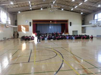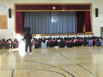 今朝は2年生が学年集会を開きました。1月に実施される校外学習の実行委員の紹介のあと、スローガンの発表、今後の取り組みについての説明が行われました。
