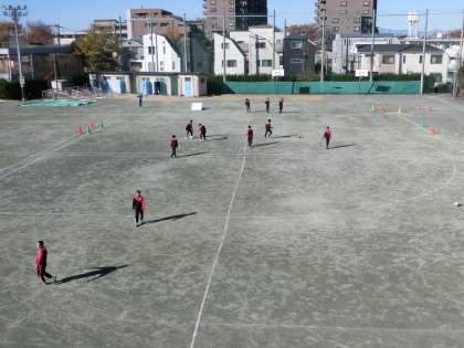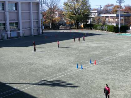 冬晴れの空の下、3年生の保健体育の授業ではサッカーを行っています。