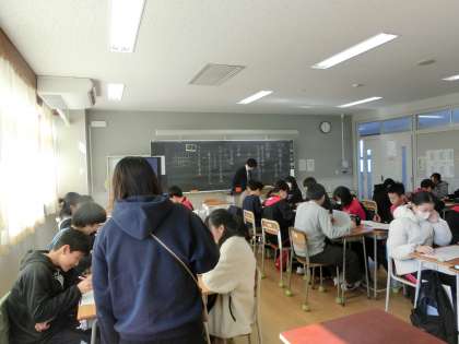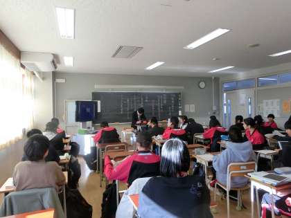 2年生の国語の研究授業の様子です。今日は「根拠を考えて意見文を書く」単元で自分の意見文を発表したあと、班で他の人の意見文を読み評価を付け、評価が高い意見文を全体で発表しました。