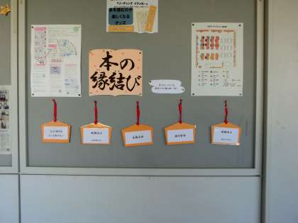 本の縁結び」 メディセンター前の廊下に絵馬の形をしたカードがあります。それぞれのカー度をめくると裏にそのカードに記された書架の位置が記されています。カードには「江戸時代をもっと知りたい」「成績向上(英語の成績を上げたい)」「災難厄除け」「旅行安全」「成績向上(勉強のやり方をしりたい)」の5種類があります。興味のあるカードをめくってみてください。