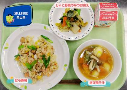 【献立】 ・ばら寿司 ・じゃこと野菜のかつお和え ・きび団子汁 ・牛乳