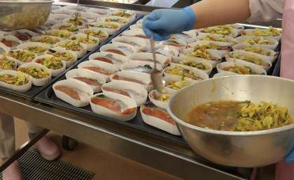 鮭と野菜の甘辛焼きは味噌ダレを絡めた野菜を鮭に乗せて焼きました。調味液も均等になるようにのせていきます。