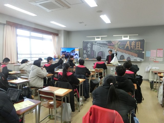 校長先生による卒業に向けてのお話です。「君たちは、どこまで羽ばたけるのか?」をテーマに1年間震災の被災地でのボランティアを行った体験を踏まえてお話されました。