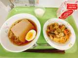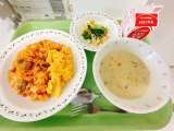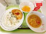 【献立】 ・わかめご飯 ・特製ソースがけジャンボ餃子 ・鶏と野菜の卵スープ ・り...