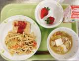 【献立】 ・焼きうどん ・鶏肉とおからの四方焼き ・博多水炊き風スープ ・いちご...