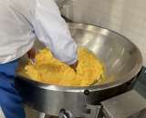 今日は今年度の給食最終日です。 チキンライスにかける卵をじっくり炒めています。加...