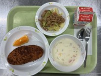 ⚪︎ココア揚げパン⚪︎焼肉サラダ⚪︎お米のポタージュ⚪︎オレンジ⚪︎牛乳