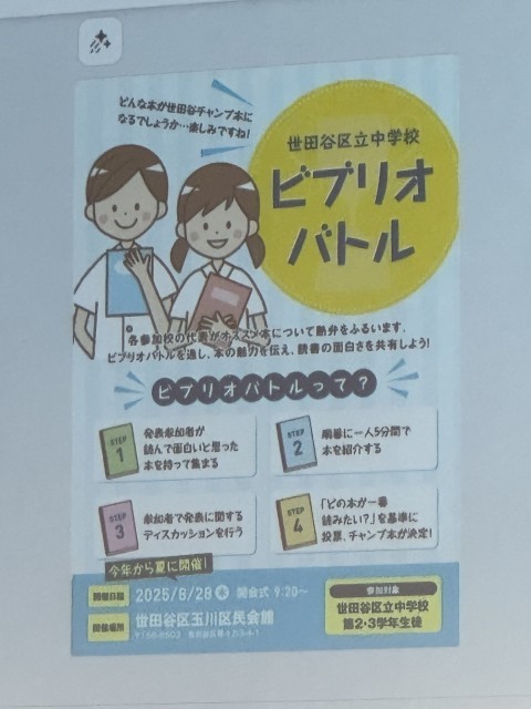 世田谷区立玉川区民会館で、世田谷区中学校ビブリオバトルが開催されました。