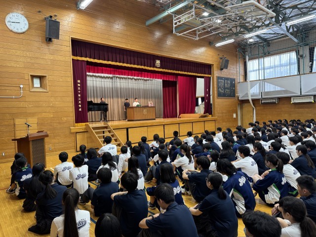始業式では、生徒代表のことば、校長先生のお話、校歌斉唱を行いました。次に、テニス部、吹奏楽部の表彰をしました。