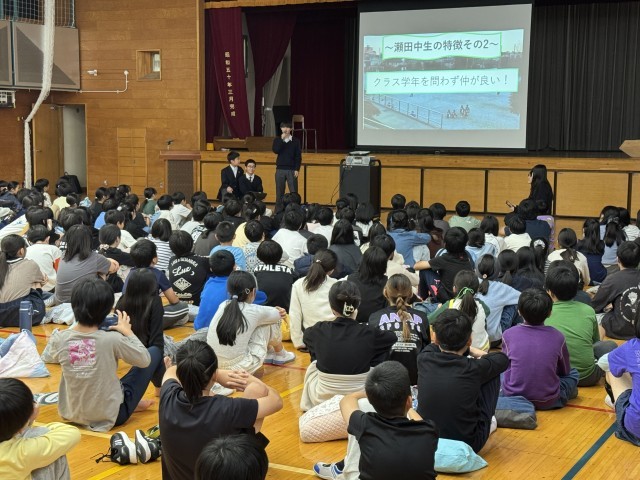 多摩川の学び舎の行事として、小学5年生が瀬田中学校で授業見学や体験授業を行いました。瀬田小学校、二子玉川小学校の児童たちは、生徒会役員の説明をしっかりと聞き、授業も真面目に取り組みました。