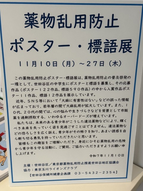 世田谷区役所東棟で、11月27日まで、ポスター・標語の展示を行っています。