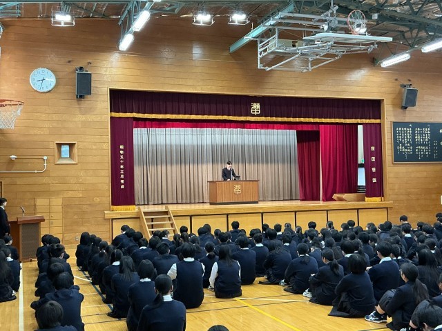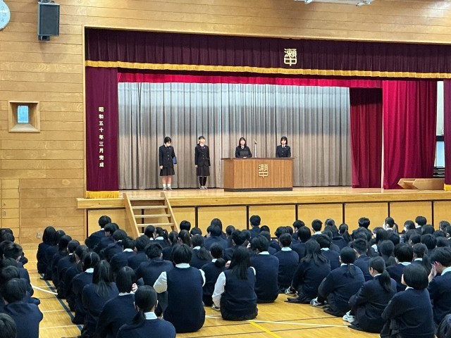 生徒会朝礼では、1年学級委員、2年学級委員、図書委員、保健給食委員より、連絡がありました。最後に生徒会役員より、生徒会サミットの報告をしました。