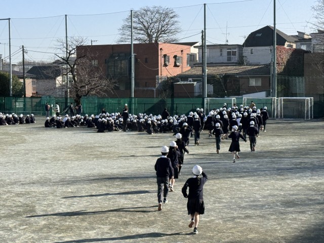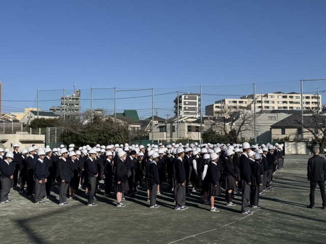 本日、地震を想定した避難訓練を行いました。生徒たちは、地域の方から寄贈されたヘルメットを着用して、真面目な態度で取り組みました。