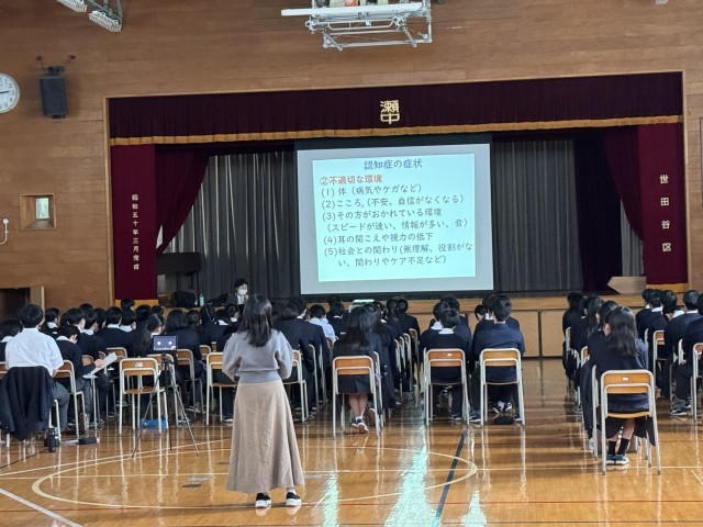 アクション講座 公開日 2026/02/20 更新日 2026/02/20 2年生 二子玉川あんしんすこやかセンターの方を講師に迎えて、アクション講座を行いました。認知症について、知識や理解を深めることを目的として、勉強しましたこと いいね(0)