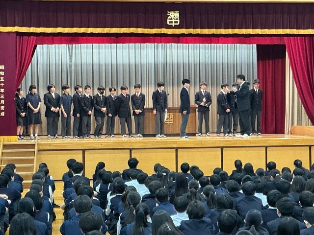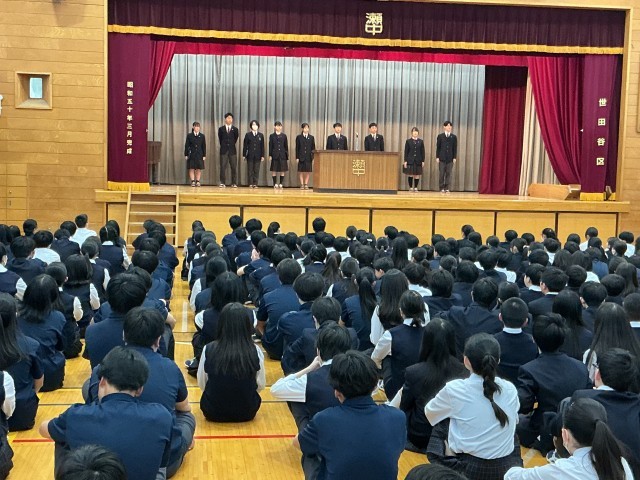4月20日月曜日、今年度初めての生徒会朝礼が行われました。生徒会長を始め、各委員長から挨拶や心がけてほしいことを立派な態度で全校生徒に向けて話していました。