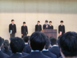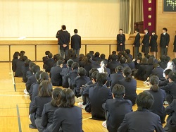 2月5日(月)、生徒朝礼では、生徒会役員の進行のもと、先週末に行われた各委員会の報告などが行われました。朝礼後、一年生が百人一首大会の表彰式を行いました。寒さの厳しいなかでの生徒朝礼でしたが、生徒たちの整然と集中して臨む姿がありました。