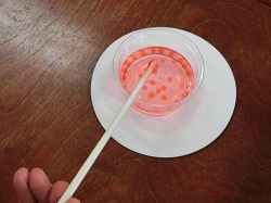 これまでに化学分野で学んだ内容の応用として、人工イクラをつくる実験を行いました。