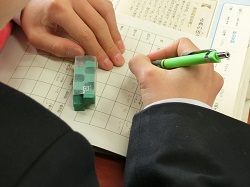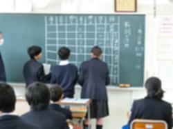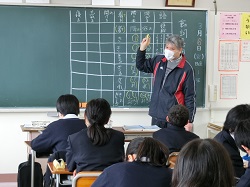 文法の学習に取り組みます。プリントを使用して前時の振り返りを行い、黒板に考えた内容を発表します。一つ一つ、解説をして確認します。動詞の活用についての理解が深まります。