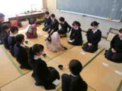 3年生は、教科「日本語」日本文化の授業の一環として、講師の先生をお招きして茶道の体験をしました。講師の先生から、お点前について分かりやすく教えていただきながら、体験は進みました。