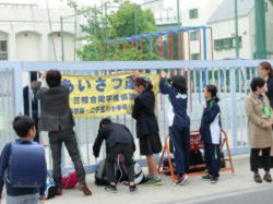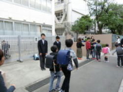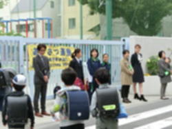 今日から水曜日まで、学び舎の瀬田小学校、二子玉川小学校、瀬田中学校であいさつ運動が行われます。1,2年生の生活委員が母校に伺い、登校する児童や地域の方々に、小学校の先生や保護者の方々とともにあいさつをします。二子玉川小学校の様子です。