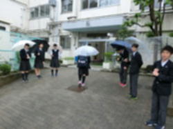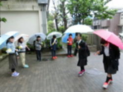 雨が降る中、瀬田小学校の児童の皆さんが、本校3年生とともに登校する中学生にあいさつをします。