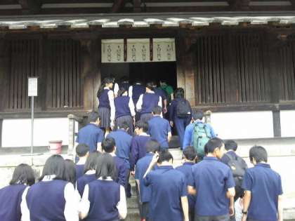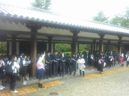法隆寺に到着し、クラスごとに見学しました。雨がパラパラ落ちる場面もありましたが、本物に触れる機会をもつことができました。バスは奈良公園に向かいます。