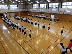 今年から全校で行う種目として実施される大縄跳びの練習に、体育館(写真 中、右)と格技室(写真 左)の2か所分かれて取り組みます。掛け声を合わせながら練習が続きます。