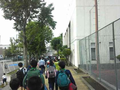 今日から二泊三日の予定で移動教室に出掛けます。集合、出席確認を済ませ、予定どおりに出発しました。生徒たちは元気です。