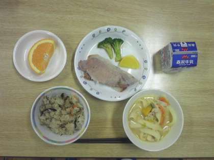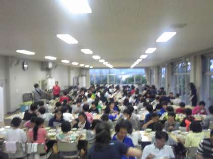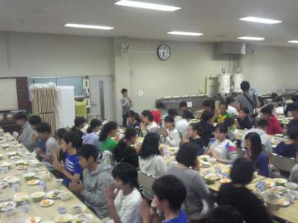 夕食の様子です。食事係の準備もスムーズに、「いただきます。」の発声で、食べ始めました。会話も弾むなか、美味しくいただきます。夜は、キャンプファイヤーが予定されています。